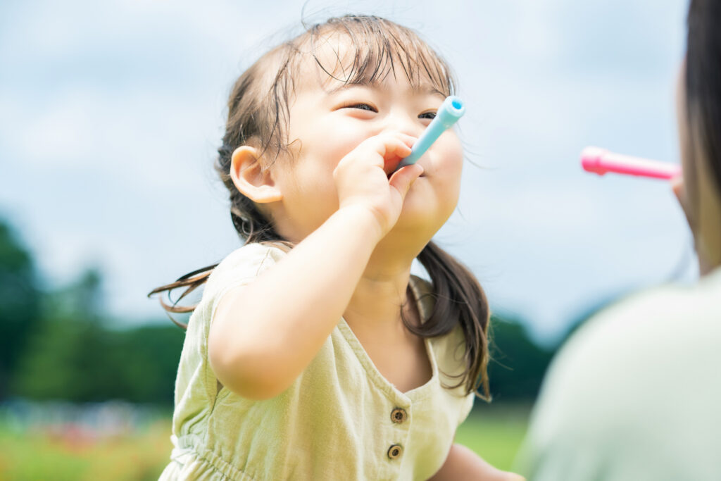 また、シャボン玉や口笛、風車を「ふーっ」と吹いて回す遊びも、自然な呼吸と口の動きを促し、口周りの筋力トレーニングにつながります。